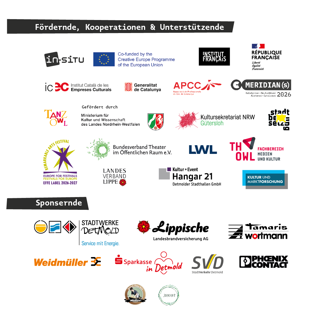 Wir bedanken uns bei den Detmolder Einzelhändler*innen und den Detmolder Gastronom*innen für die Unterstützung des Festivals und bei allen, die ihre Gebäude und Flächen für Aufführungen zur Verfügung stellen.